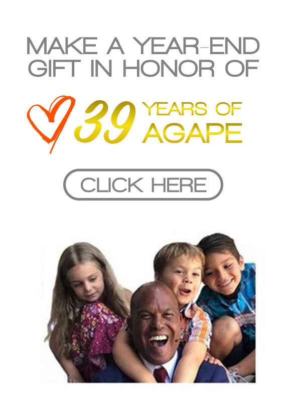 Make your generous year-end gift in any amount. We are looking for 100% community participation to sustain Agape's 30 ministries, staff, ongoing programs, services, daily operations, and infrastructure expansion, allowing us to continue to serve our growing global presence with:
